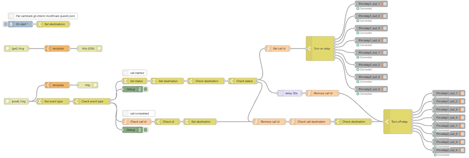 Al termine della chiamata o dopo un timeout di 30 secondi, Node-RED spegne il lampeggiante disattivando il relè corrispondente.